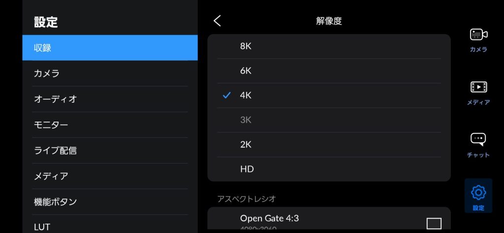 こちらはBlackmagic Cameraアプリの設定画面。Blackmagic Cameraアプリでは解像度で6Kを選ぶことも可能。6Kや4Kでは上下を広く撮るOpen Gate4:3収録にも対応しており、クリエイティブな動画制作にも対応可能。