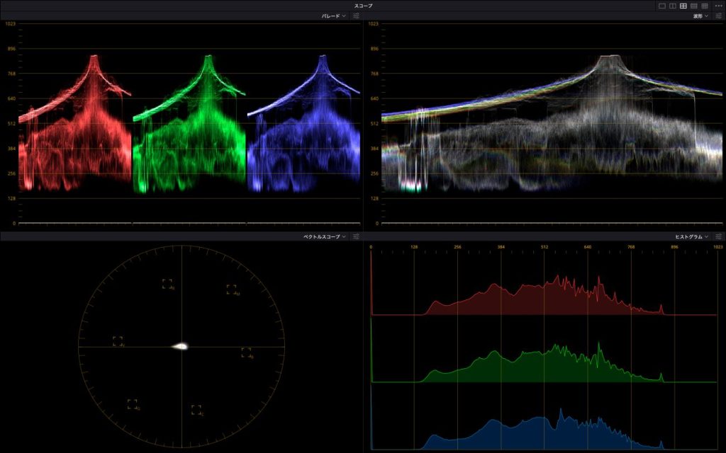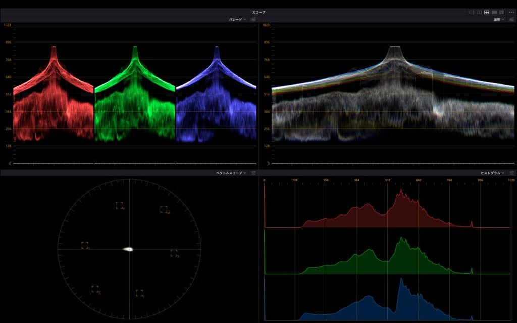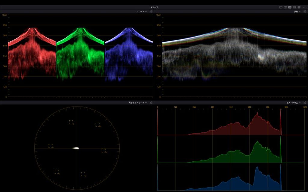 Davinciの波形表示。太陽は白飛びしているが、そこから滑らかにつながっている。