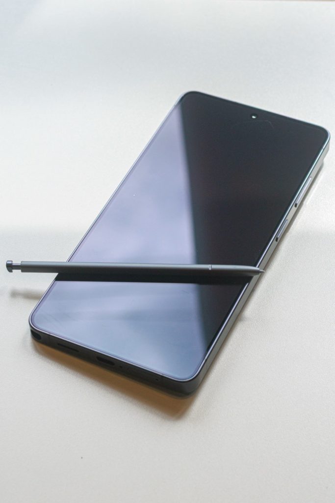 デザインを見てみます。外観はこれぞスマートフォンなスタンダードスタイルです。ラウンドしながらエッジが立ったシェイプやレンズの出っ張りを段差で収めるデザインラインは近年では見慣れたものになりました。底部にはスピーカー、充電と通信用のUSB-Cコネクタ、SIMスロット、そしてGalaxyではお馴染みのスタイラスペンが収納されています。ちょっとした操作には重宝しそうです。