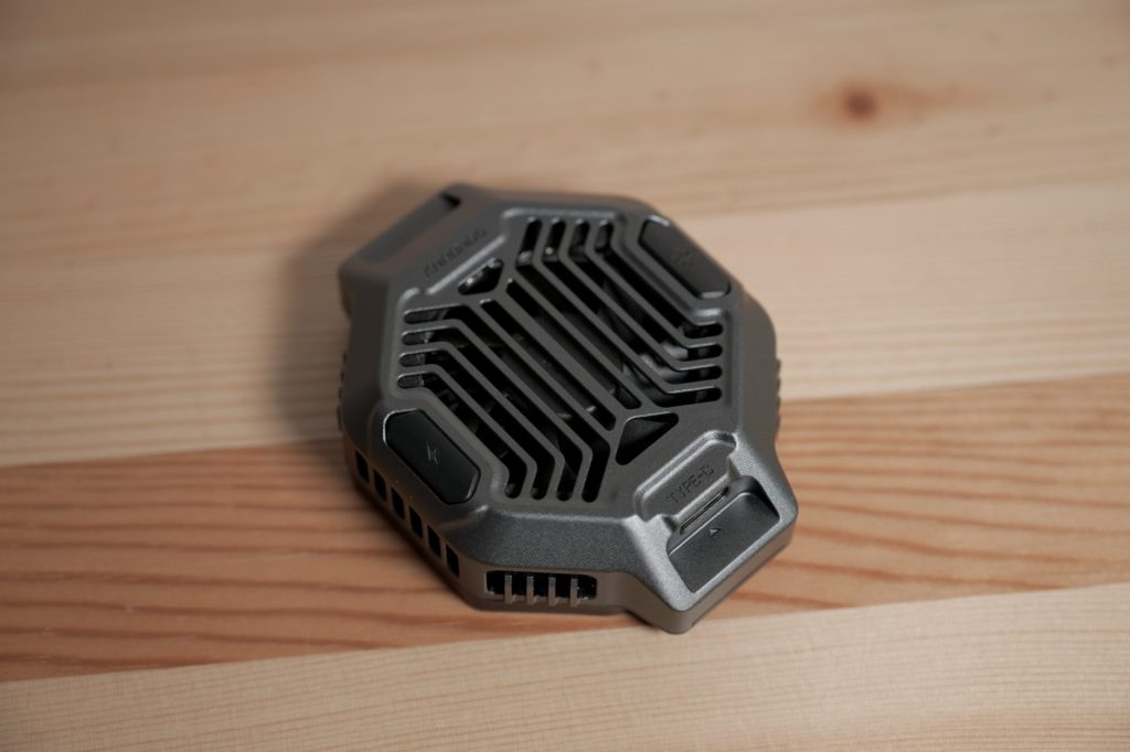 PDハンドルからの電気を、前述のドットを通して受け入れ、iPhoneの冷却とMagSafe充電を可能にするクーリングファンです。冷却と充電はそれぞれ2段階で調整が可能。初代のモデルでは電圧の関係で不可能だった、USB-Cハブを介してのアクセサリーの接続とクーリングファンの同時使用が可能になりました。