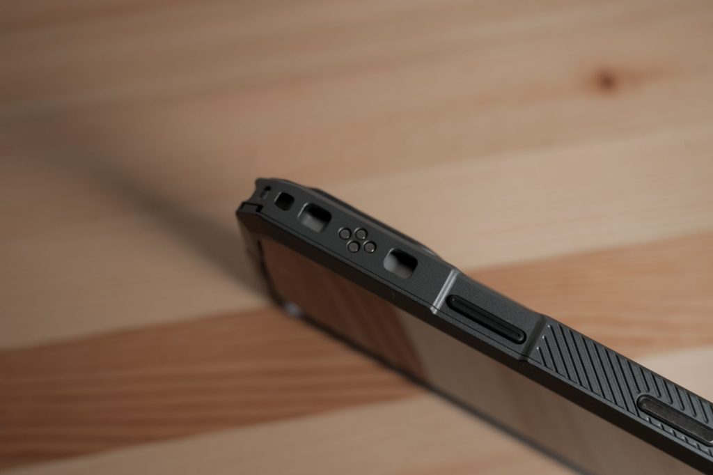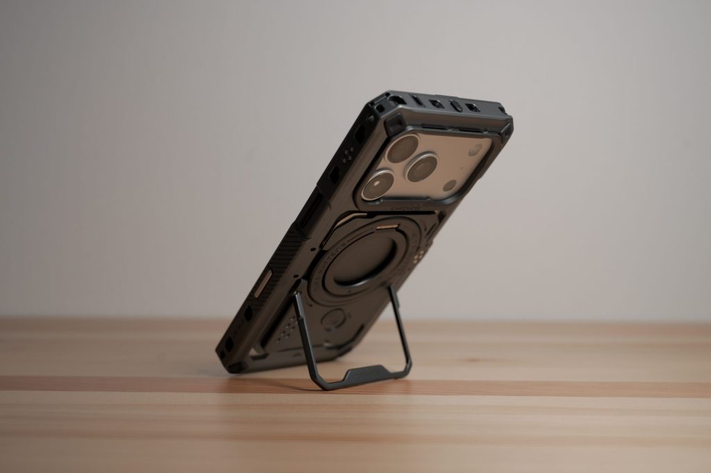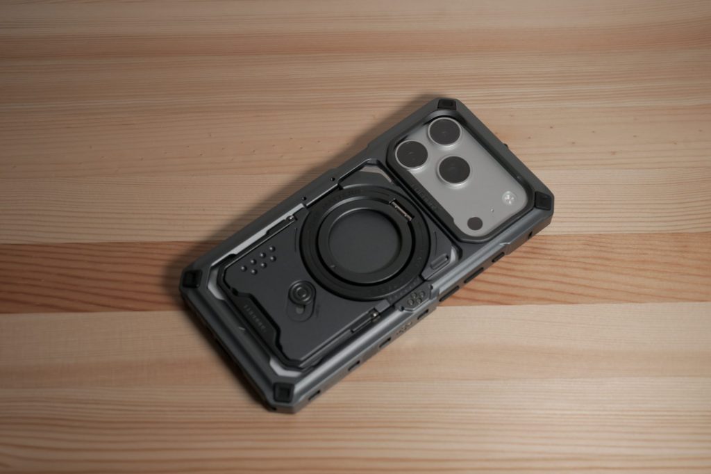 そして注目すべきは、iPhone本体のデザインを過度に覆わない点です。多くのiPhone用リグが「包み込む」方向に行き、iPhoneのコンパクトさをあまり活かさない中で、KhronosはiPhoneのプロダクトデザインを尊重しつつ、必要最小限の構造で高い剛性を確保しています。スマートフォンを“ガジェット”ではなく、“撮影機材”として扱うための思想が、造形から明確に伝わってきます。