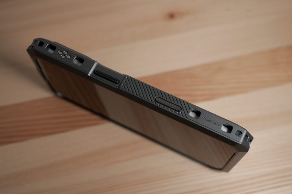 TILTA Khronosを手にしてまず感じるのは、デザインと質感の完成度の高さです。アルミのフレームは、スマートフォン用アクセサリーというより、シネマカメラ用ケージに近い印象を受けます。
