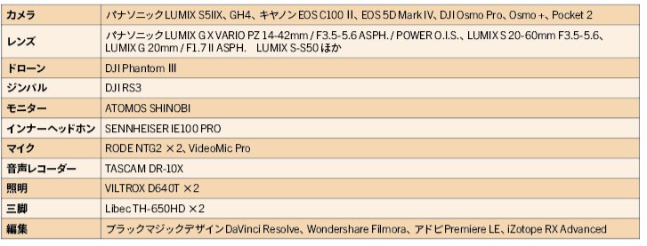 カメラはLUMIX S5IIXを使用し4Kで撮影した。海辺の景観などはDJI Phantom IIIにて撮影。 照明は 自然光とバウンスを中心に、室内シーンではLEDライトを最小限に使用した。