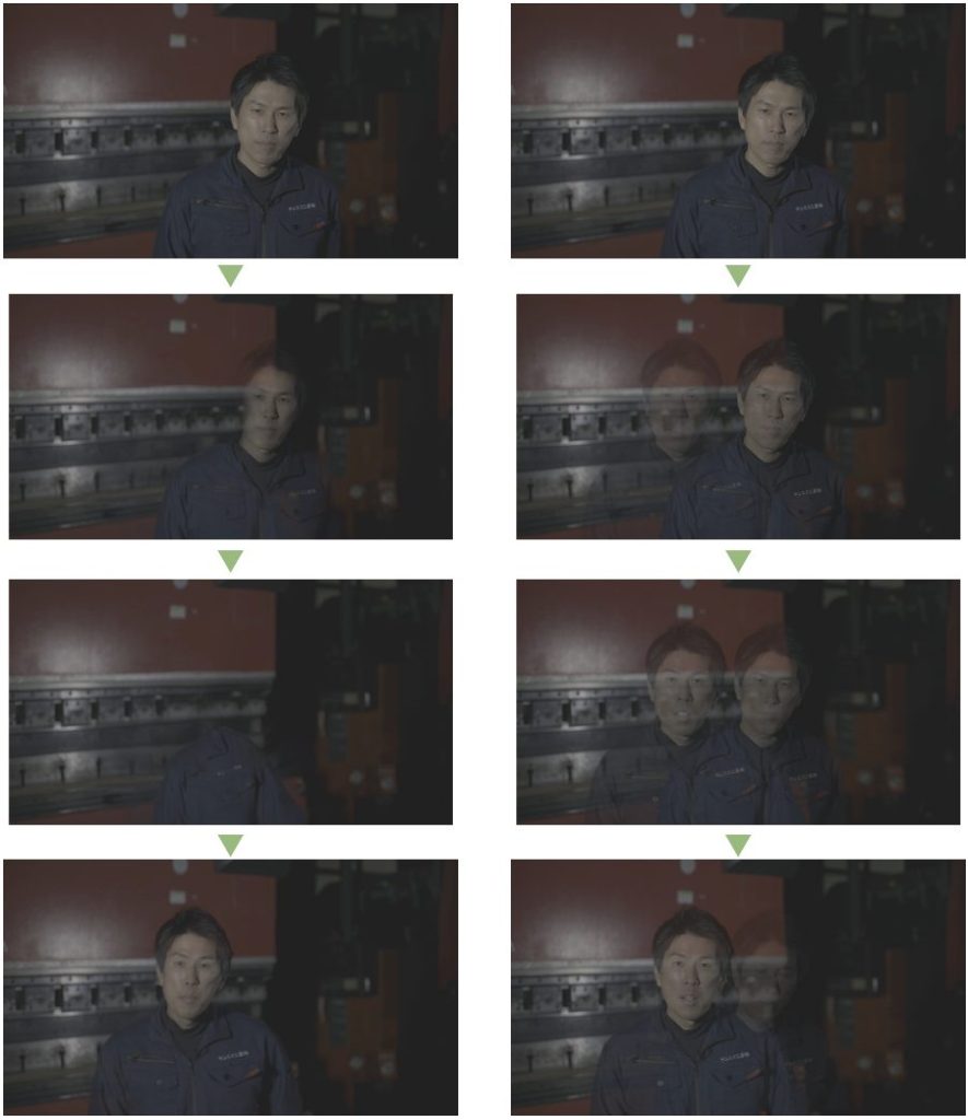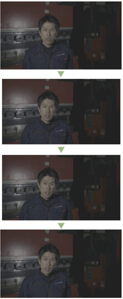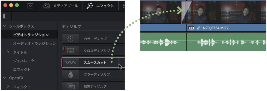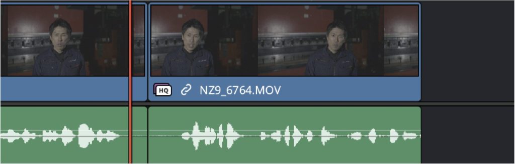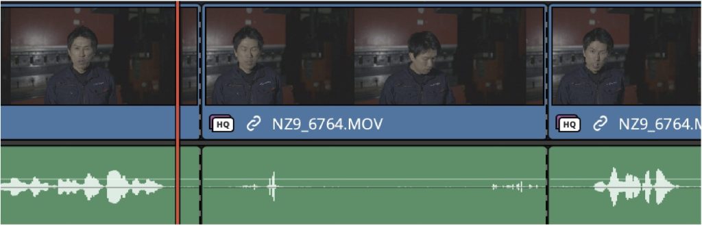インタビュー映像を例に、途中で話者が下を向いた部分をカットしたことでジャンプカットになってしまった部分に適用してその効果を実際に試してみました。