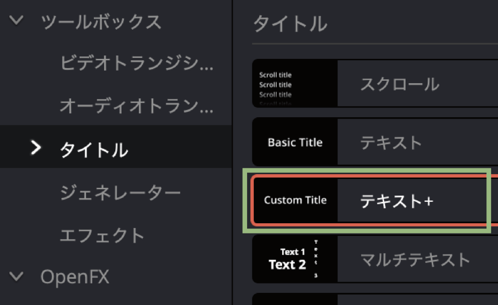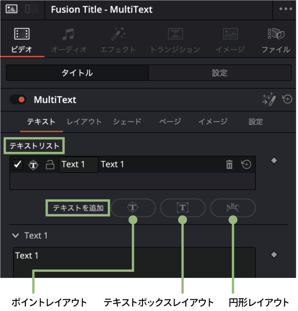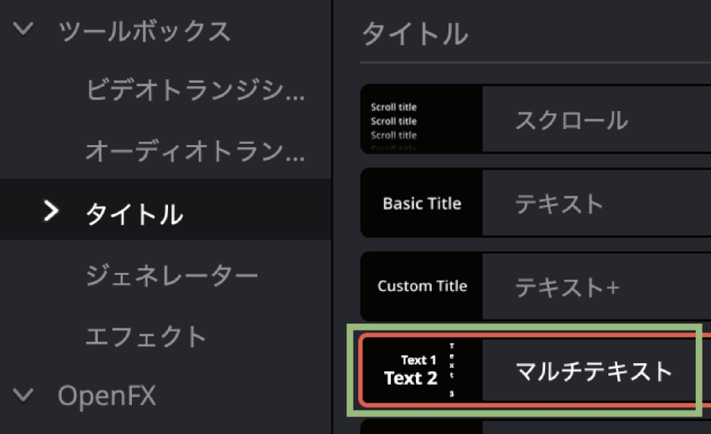 エフェクトの「タイトル」に追加されたのが「マルチテキスト」です。この機能は従来からあるFusionをベースにした「テキスト+」を複数のレイヤーで追加できるようになったもの。Fusionの「マルチマージ」や「マルチポリ」と同じような扱いになり、ひとつのテキストクリップで複数のレイヤーを扱えるようになります。