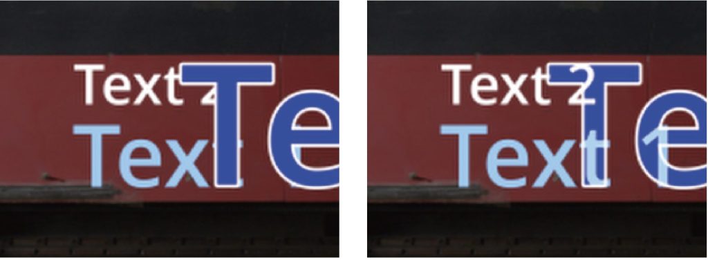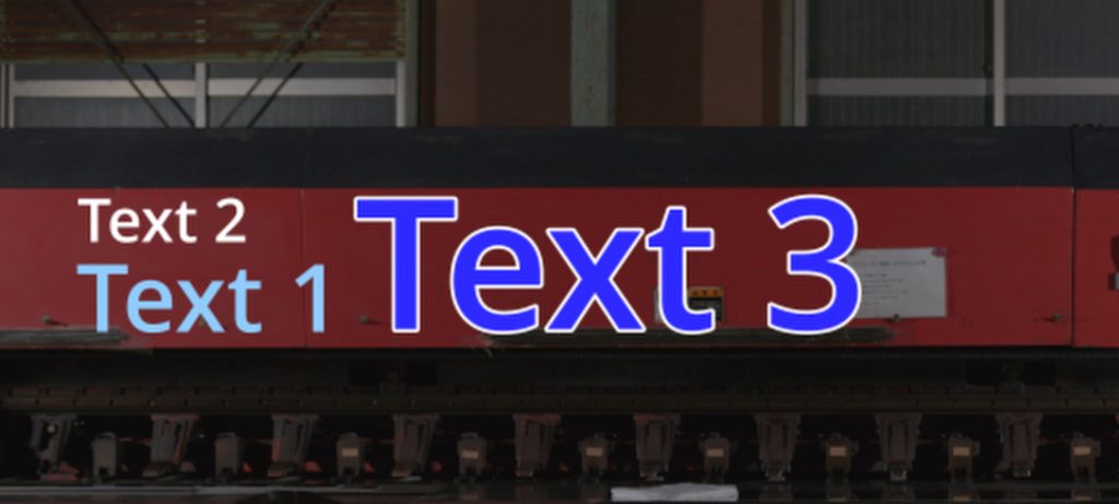 これまで右のように、同じ画面にサイズや色を変えたテキストを複数混在させたい場合、「テキスト+」を幾重にも重ねる必要がありました。この作成の場合ならレイヤーを3つにする必要がありましたが、「マルチテキスト」を使えば、ひとつのレイヤーだけで済みます。