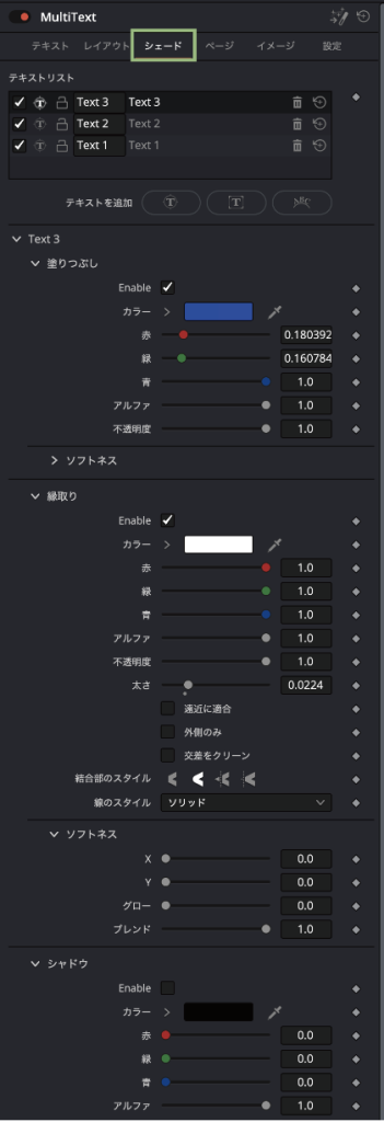 「マルチテキスト」のインスペクタを開くと、リスト内でレイヤーを重ねるようにテキストを追加でき、それぞれを選択するとパラメーターを個別に変更できます。