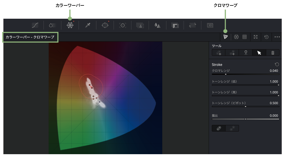 「クロマワープ」は「カラーワーパー」の中に新たに追加されたパネルになり、色を変更したり、彩度を変えたりといったこれまでの機能を踏襲しつつ、使い勝手が大きく向上されています。色を指定するインターフェイスは色域図のような、よりベクトルスコープ的な見た目になっているのが特徴です。中心に行けば行くほど彩度は低く、外側が高くなり、色の配置も同じです。