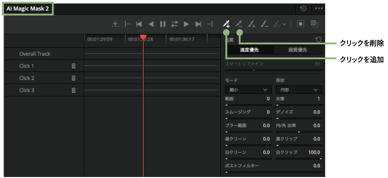 AIの機能がより強化されて「AI Magic Mask 2」に進化し、作業効率が各段に向上しています。従来は選択する“対象物が何か”を選択してから対象物の上をドラッグして線を引いて抽出していましたが、対象物を選択する必要がなくなり、クリックするだけの選択方式に変更になりました。