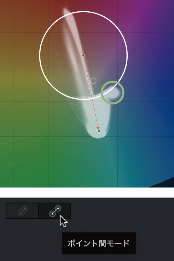 それに対して「ポイント間モード」は、選んだポイントは引っ張られますが、移動先までは干渉しません。彩度を変更したとき、周りの色が引っ張られないので、変更した影響が他の色に及ばない調整をしたいときに最適です。