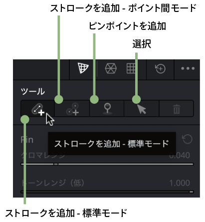 その際に使用する「ストロークを追加」ツールには挙動を変える「標準モード」と「ポイント間モード」のふたつのツールが用意されています。「標準モード」は、選択した色&彩度のポイントを動かしたとき、動かした場所に合わせて他の色と彩度も干渉するモード。