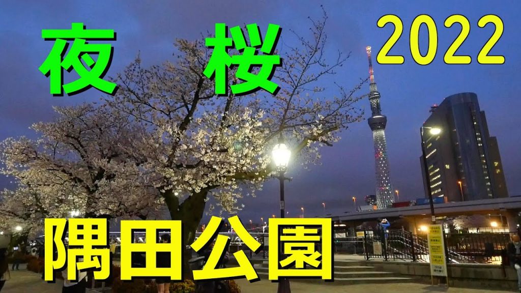 台東区側から眺めると川越しにそびえる東京スカイツリーを桜と一緒に楽しめます。浅草から近いこともあって夜でも観光客が大勢訪れています。